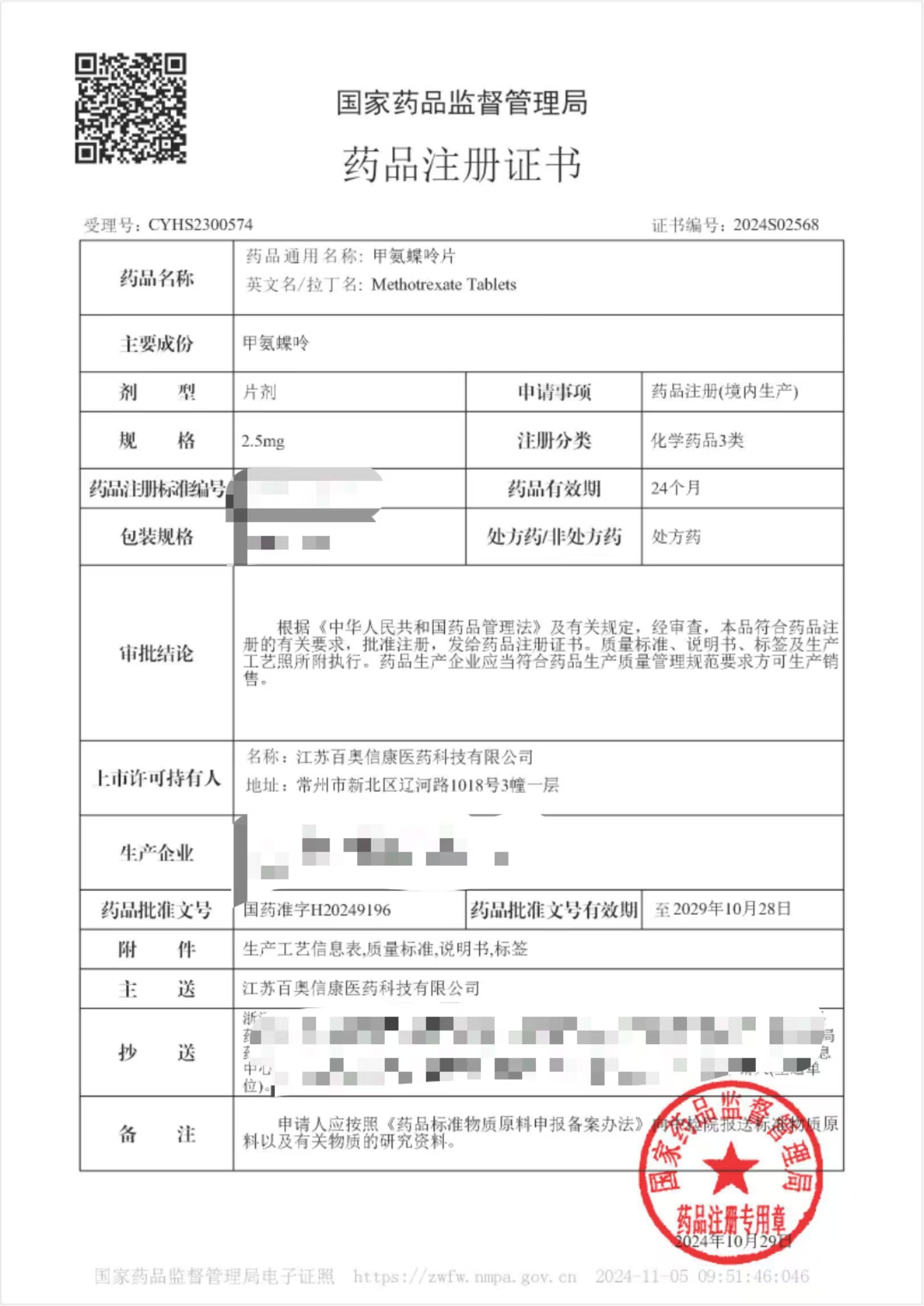 近日,江苏百奥信康医药科技有限公司(以下简称“百奥信康”)收到国家药品监督管理局核准签发的甲氨蝶呤片(规格:2.5mg)《药品注册证书》,证书编号:2024S02568。