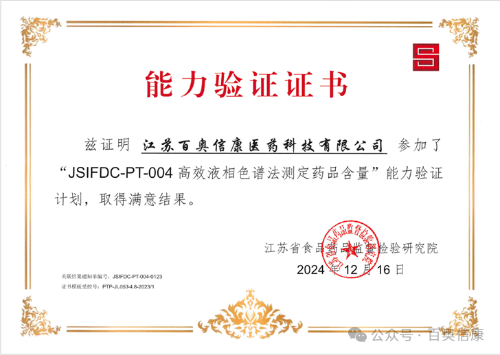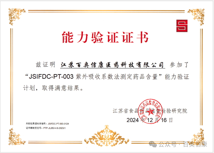 2024年12月,江苏百奥信康医药有限公司在参与本年度江苏省食品药品监督检验研究院组织的能力验证工作中再获佳绩,在JSIFDC-PT-003紫外吸收系数法测定药品含量和JSIFDC-PT-004高效液相色谱法测定药品含量两项能力分别作为常州市唯一一家药品研发机构取得了“满意”结果,获得了《能力验证证书》。